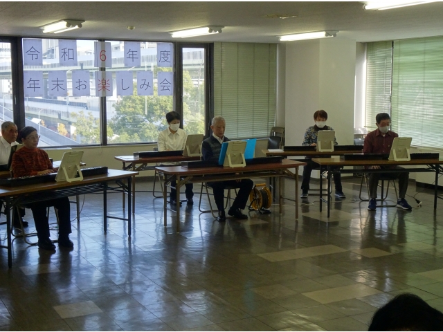 前半は所長挨拶に続き、合唱・独唱5曲、電子ピアノ演奏3曲、ダンス2曲の発表があり、手や耳のツボを効率よく刺激して全身の血液循環を促す健康法「健康十巧」に全員で取組んだあと休憩に。