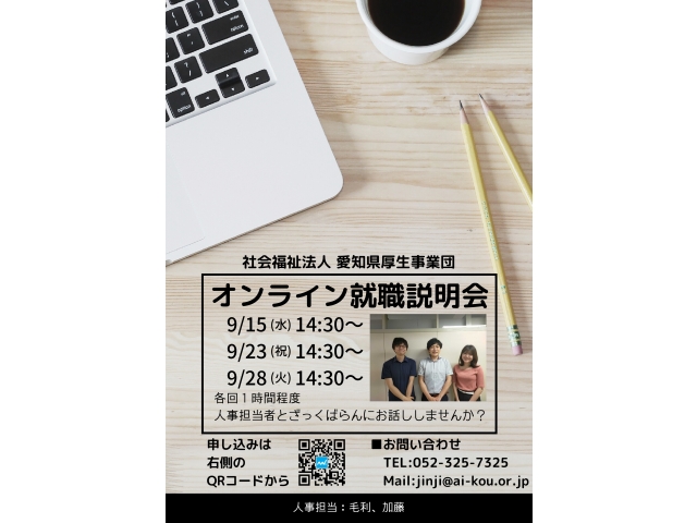(1)写真のQRコードから、またはマイナビのサイトにて「愛知県厚生事業団」と検索してエントリーをする